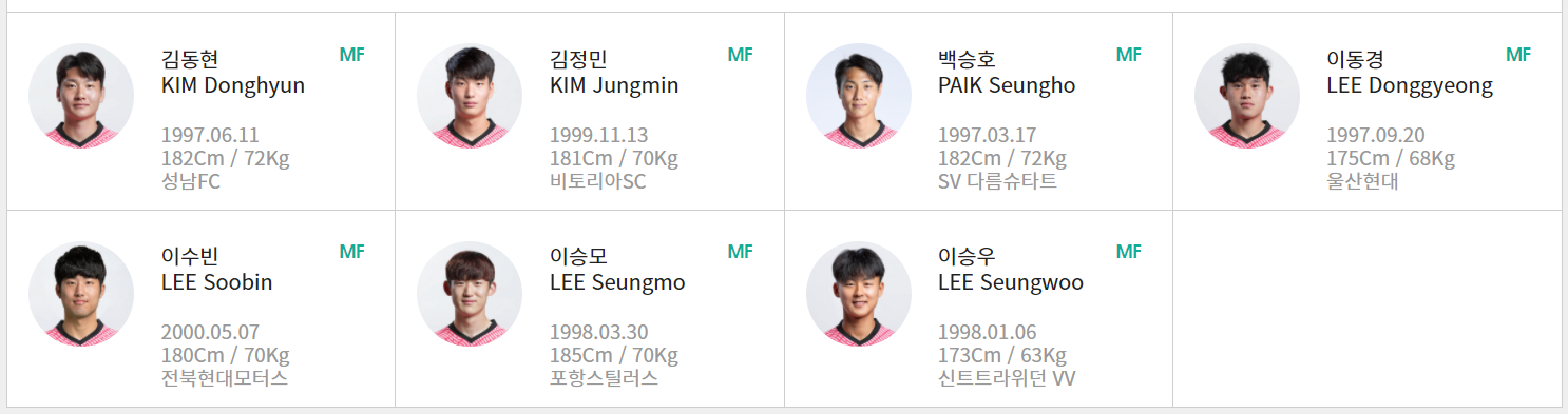 미드필더: 김동현, 김정민, 백승호, 이동경, 이수빈, 이승모, 이승우