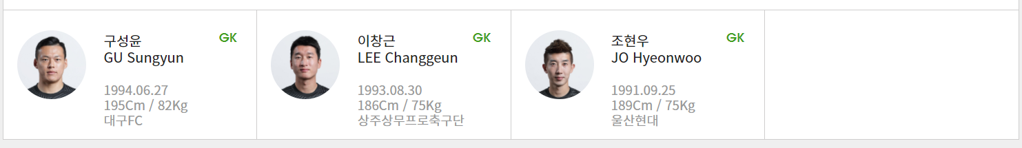 골키퍼: 구성윤 (대구FC) 이창근 (상주상무) 조현우 (울산현대)