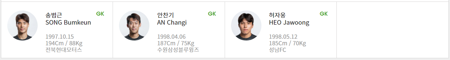 골키퍼: 송범근, 안찬기, 허자웅